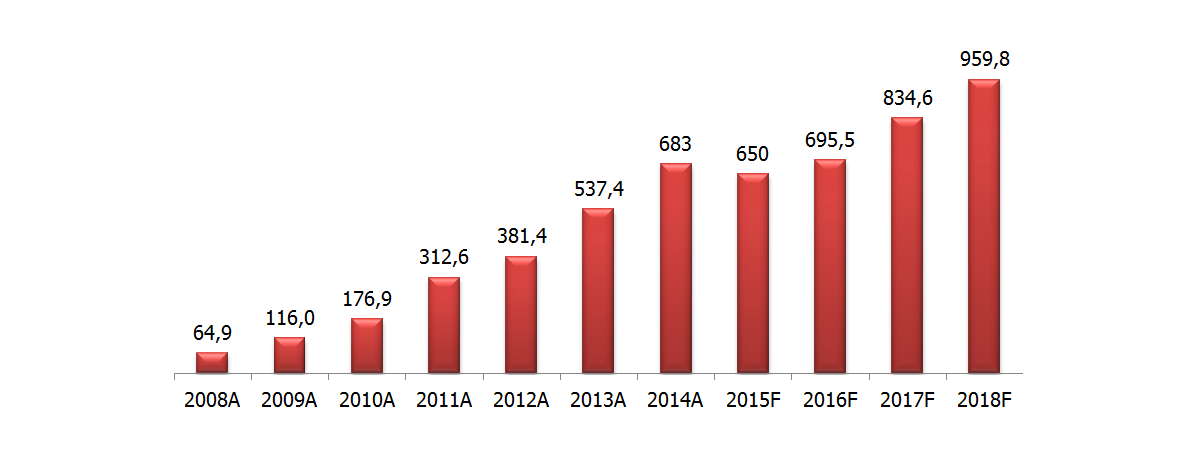 Объем рынка интернет-торговли 2008-2018гг., млрд рублей